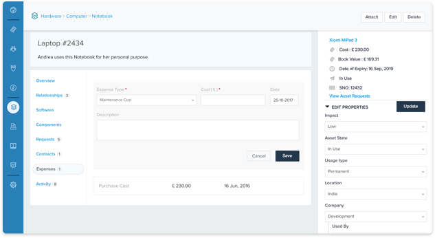 With an extensive record of information about all the assets in stock or in use within the organization, get visibility into all asset data and its history. Understand who owns the asset currently and its prior details, and make decisions about the asset’s stock replenishment based on availability or capacity.