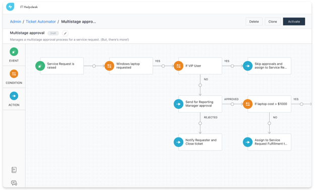 Auto-assign tickets to the right agents or groups, setup multilevel approvals, and automate processes like travel desk approvals, employee onboarding, etc. using workflow automator. Our simple drag and drop interface and out of the box workflows were designed to get you started right away.