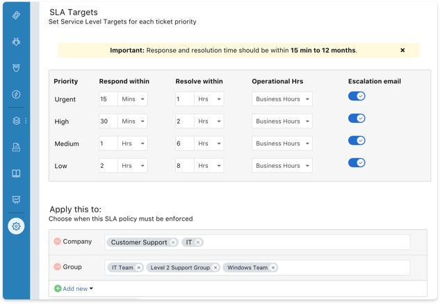 Define task deadlines based on different criteria – be it source, type, group, or ticket priority – and ensure timely resolution of issues.