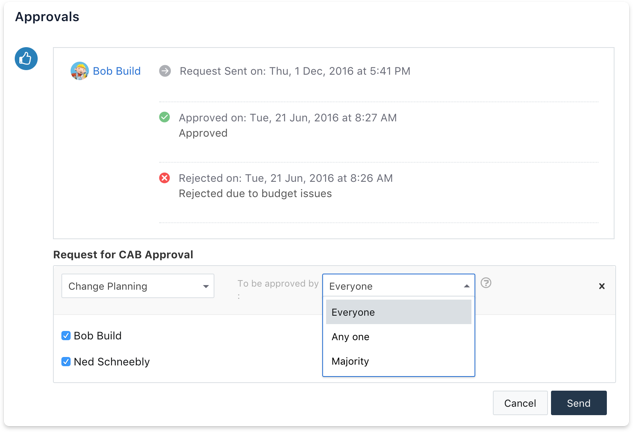 Set up hierarchical approvals, notify the Change Advisory Board, and approve or reject changes based on their recommendations and comments from the portal.